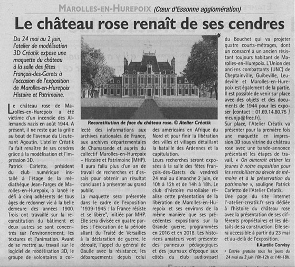 Pour l’exposition des « 80 ans de la libération de Marolles-en-Hurepoix en 1944 », le Républicain a eu l’occasion de nous interviewer par rapport au Château Rose.